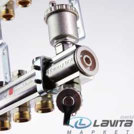(VTc.594.EMNX) Коллекторный блок для систем водяного радиаторного и напольного отопления (водяной теплый пол) с регулировочными (настроечными) и ручными (с возможностью установки электротермического сервопривода) запорными клапанами, автоматическими воздухоотводчиками и дренажем. Диаметр коллекторов – 1 или 1 1/4". Число выходов – от 3 до 12. Диаметр патрубков – 3/4", резьба – наружная, стандарт присоединения – «евроконус». Рабочая температура теплоносителя – до 120 °С, давление – до 10 бар.